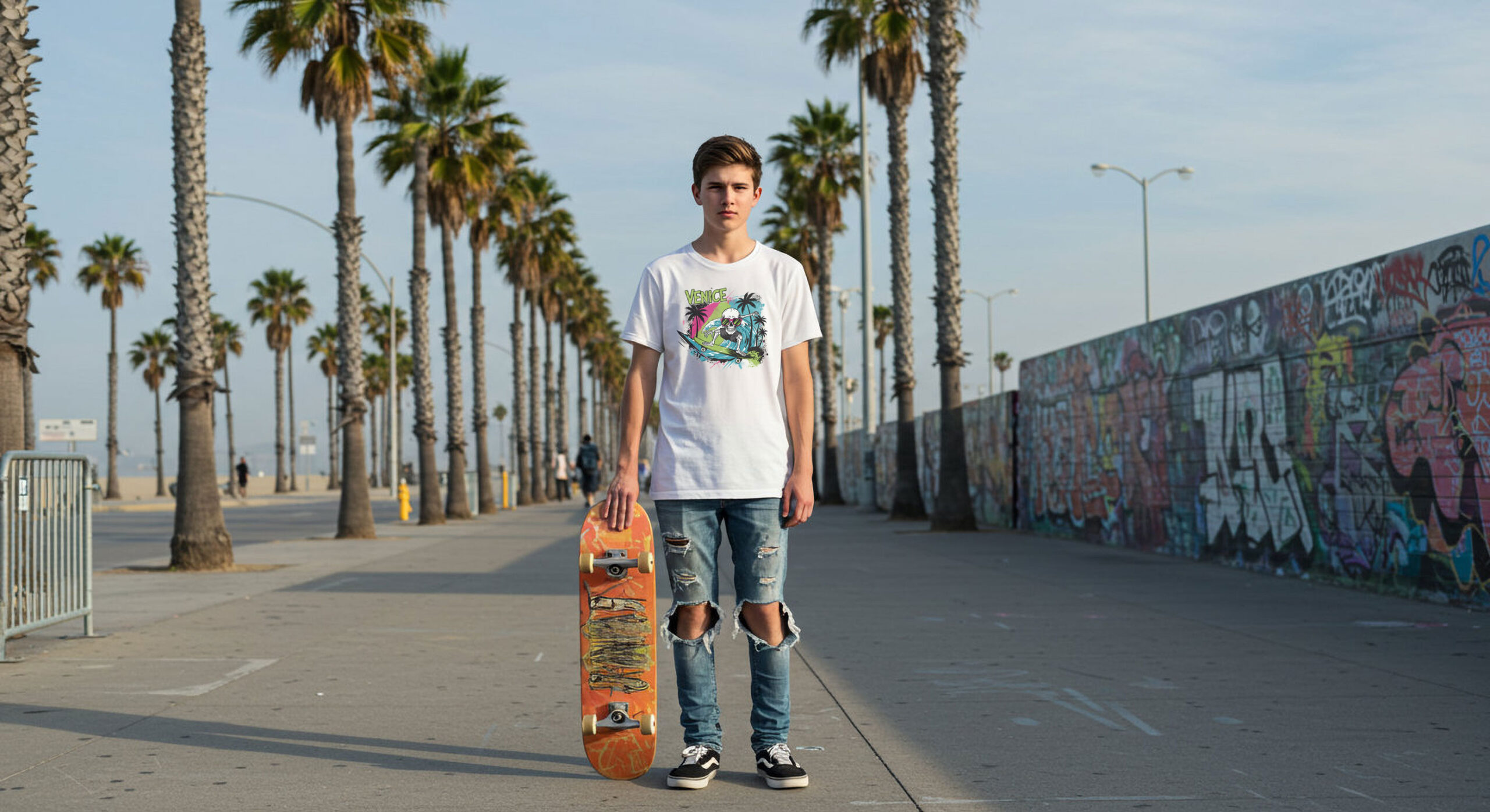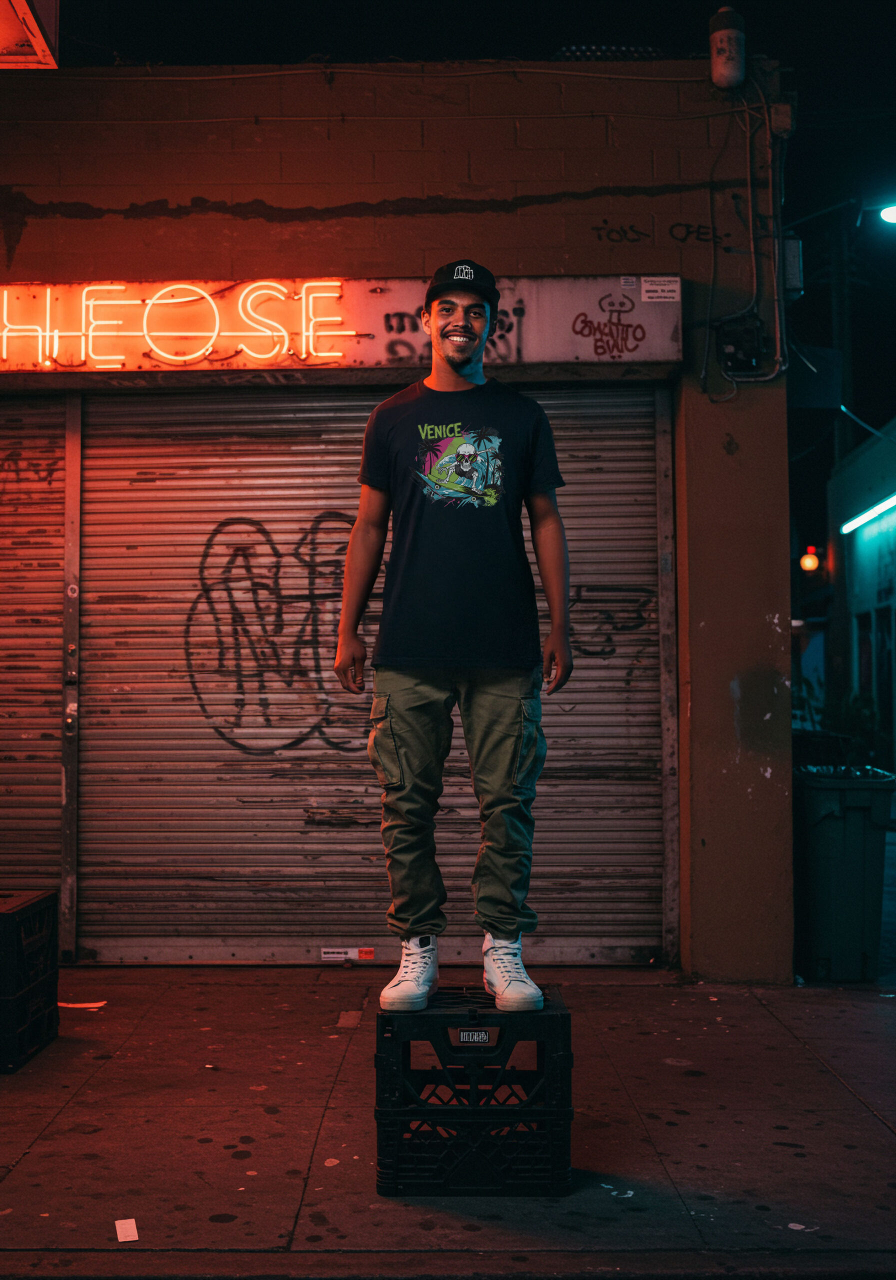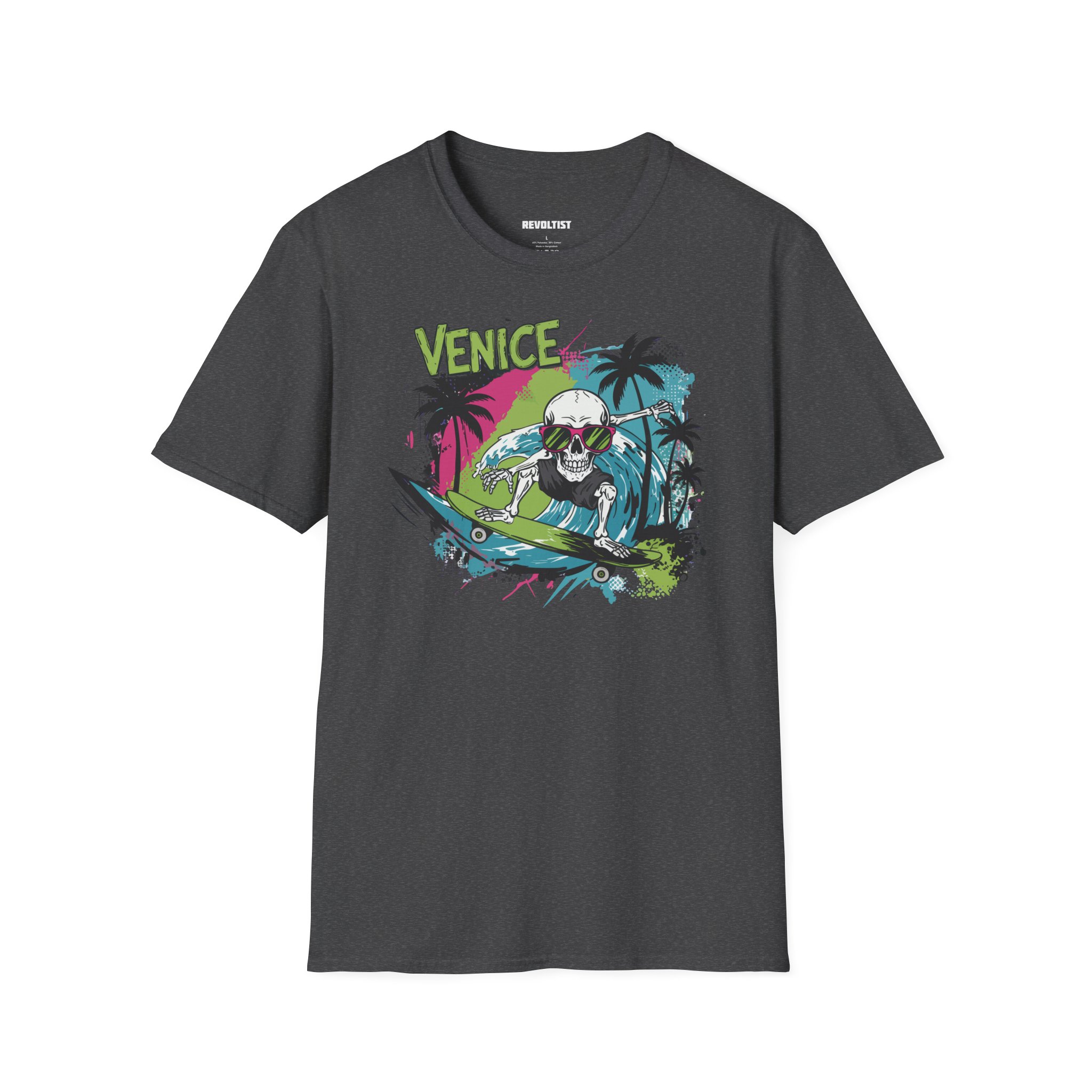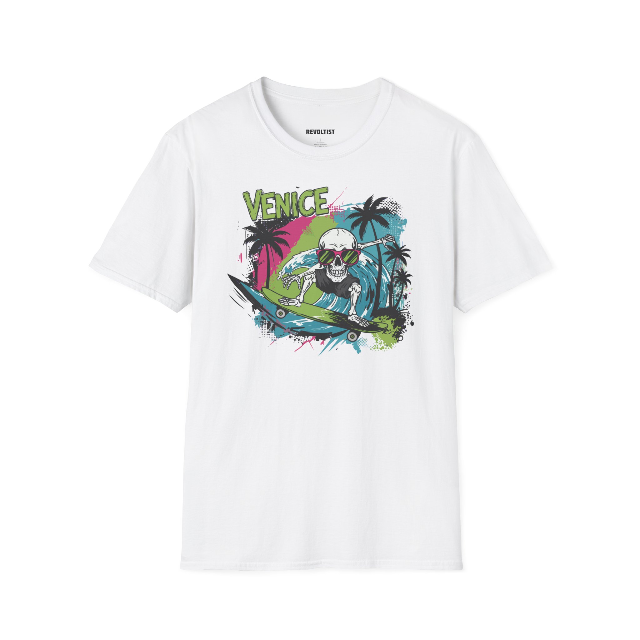 Bring a touch of vintage 80s style to your wardrobe with this Venice Beach Surf Skateboard Skeleton T-Shirt. Perfect for those who love retro fashion and beach culture. Ideal for casual wear, beach days, or skateboarding outings. Great for summer vibes and nostalgic feels.